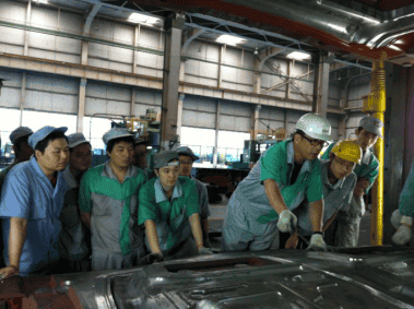 响应“开门”学习,庆铃模具结构组多次组织研讨会,期间有对级进模、翻边整形模和修边冲孔模等结构标准的强化培训,也有对完成任务中存在质量问题及项目的总结,并组织现场分析探讨扣合模的使用和模具镶块的热处理等,加强对模具结构设计的认识。积极走出“家门”,到广州学习CATIA逆向设计,到数码模等兄弟厂家交流学习。