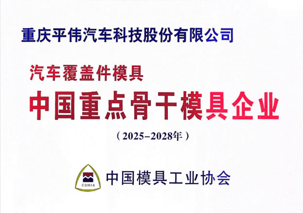 近日,中国模具工业协会九届十次理事会、中国重点骨干模具企业工作会议在上海召开,会议期间,正式公布“中国重点骨干模具企业”的评定结果,重庆平伟汽车科技股份有限公司凭借在汽车冲压模具制造领域的卓越表现,再度荣获“中国重点骨干模具企业”荣誉称号。