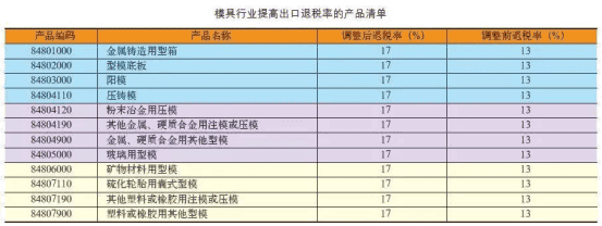 2016 年11月4 日,财政部、国家税务总局发布《关于提高机电、成品油等产品出口退税率的通知》(财税[2016]113号),将照相机、摄影机、内燃发动机、汽油、航空煤油、柴油等产品的出口退税率提高至17%,并自2016 年11 月1 日起执行。本通知所附《提高出口退税率的产品清单》中,模具行业提高出口退税率的产品清单具体如下表所示: