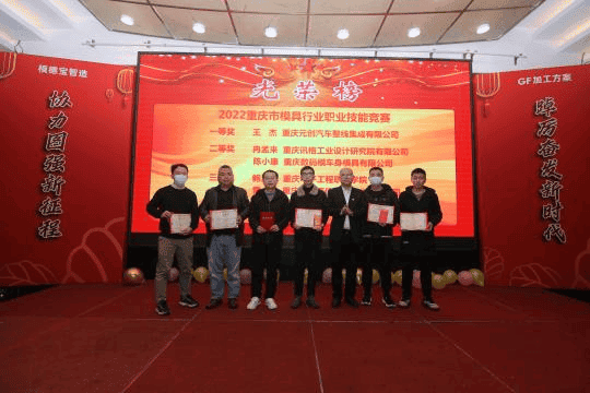 会议对获得2022重庆市模具行业职业技能竞赛奖项的王杰等9名获奖人员、重庆长安汽车模具事业部等2家获奖单位进行了隆重表彰,为谭鹏伟等6名2021“重庆市卓越模具工匠”颁发证书,为2021全国模具行业职业技能竞赛中代表重庆地区参赛获得荣誉的长安汽车模具事业部团队、重庆东科模具制造有限公司团队进行了表彰,长安汽车模具事业部团队荣获职工冲压模具(车身)组特等奖,东科模具团队荣获2021全国模具行业职业技能竞赛职工压铸模具组三等奖。