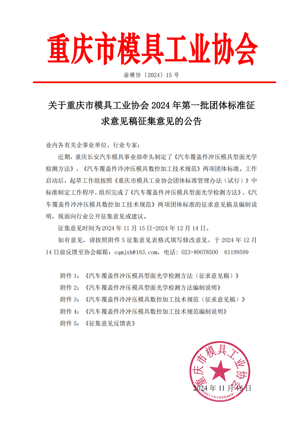 关于重庆市模具工业协会2024年第一批团体标准征求意见稿征集意见的公告