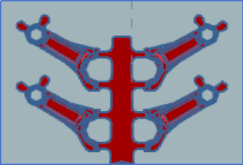 分型面的位置取决于压铸件几何特征。选取连杆体的对称面作为分型面,充分利用其结构简单和对称性的优势,简化模具设计并优化成型过程。初步确定浇注系统采用一模四腔的形式,4个连杆体压铸件通过内浇口与横浇道连接,横浇道又与直浇道相连。经计算,压铸件和浇注、溢流排气系统在分型面的总投影面积为87.24cm2。再根据经验,确定连杆低速填充,选取内浇口厚度为3mm、长3mm,宽6.8mm,充填时间为0.12S。其效果如图2所示。