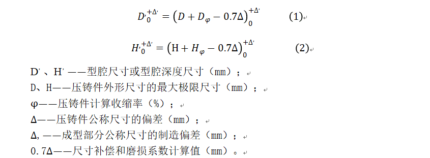 成型零件在工作时直接与金属液接触,需要其具有较高的强度硬度及耐热疲劳性,故采用4Cr5MoV1Si制作成型零件,热处理后硬度达到43-47HRC。压铸模具型腔尺寸的推荐计算公式见式(1)和式2):