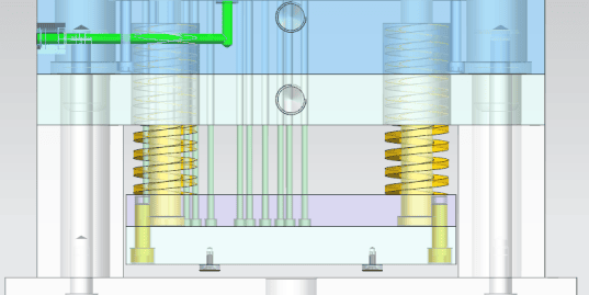 (2)采用4Cr5MoV1Si作为成型零件的设计材料,确定动模尺寸为16.58mmx29.67mmx11.71mm,定模尺寸为12.35mmx10.36mmx12.37mm。设置了25根直径为5mm的推杆,采用环形水套冷却,水道长度为265cm。