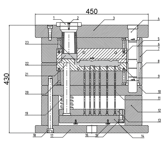 1-浇道套;2-内六角螺钉;3-定模座板;4-导柱;5-导套;6-定模镶块;7-定模套板;8-动模套板;9-动模镶块;10-支承板;11-推杆;12-垫块;13-推杆固定板;14-推板;15-紧固螺钉;16-限位钉;17-定模座板;18-螺栓;19-弹簧;20-紧固螺钉;21-复位杆
