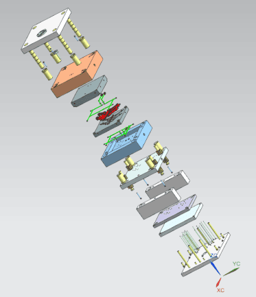 (a) 模具2D装配图 (b) 模具3D爆破图