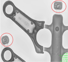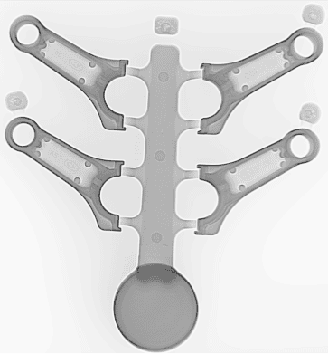 (a)连杆体铸件外观 (b连杆体铸件X-Ray探伤 (c) X-Ray探伤局部放大显示