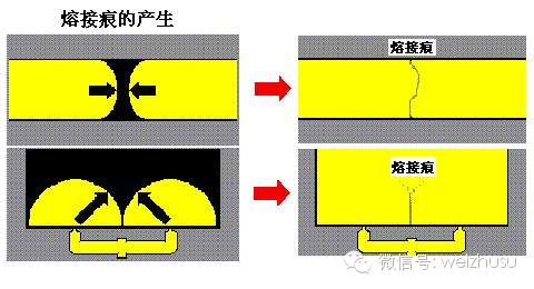 在熔接痕处产生喷泉状的流动行为和取向,是导致该处力学强度差的原因之一